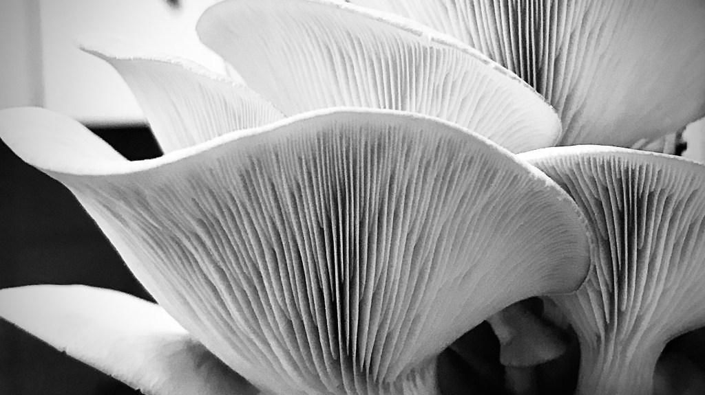 I bought a kit off the net and off I went. Mushroom kits these days aren’t the kind of mould-prone, button mushroom boxes your parents used to keep under the laundry sink when you were a kid; they’re cute, kitchen friendly, oyster mushroom growing boxes of wonder. And these babies grow FAST. And they are BEAUTIFUL. Deeply unsettling if you think about them too much (like I did one night resulting in not very pleasant dreams) but very cool, and yes, very, very edible. I have no idea how long my obsession will last, but it’s been really heartening to see these bizarre growths triumph on top of my fridge without me doing almost anything at all…